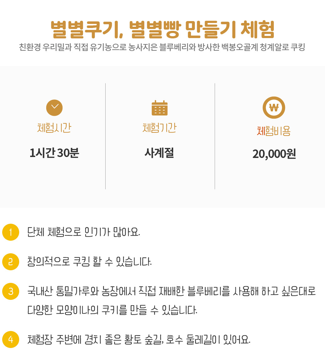 - 부대시설 : 체험장, 화장실, 공방 카페, 치유정원, 황토길 맨발걷기, 호수둘레길