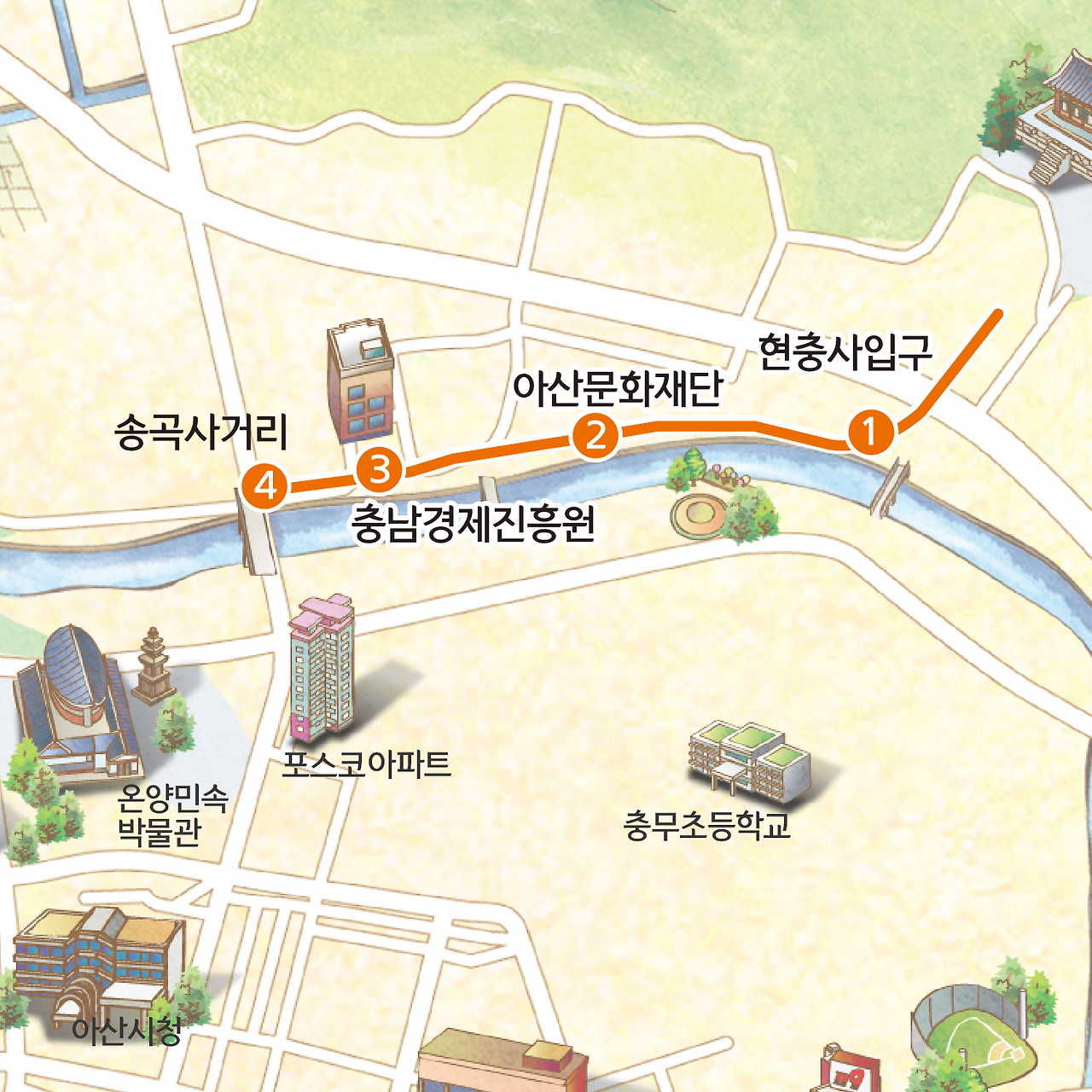 코스소개 : 심은 지 50여 년이 지나 연령이 60년이 넘은 은행나무 가로수는 이제 아름드리 나무로 자라 사계절 방문객들의 발길을 멈추게 하고 있다. 현재 은행나무길에는 총 350여 그루가 자라고 있고, 은행나무 길에서 펼쳐져 보이는 곡교천은 잘 가꾸어진 경관과 철새 등 사람과 자연 경관이 함께 공존하는 도심 속 살아 숨 쉬는 생명의 휴식처이다. 사시사철마다 형형색색의 이미지로 관광객들의 발길을 모으고 있다.